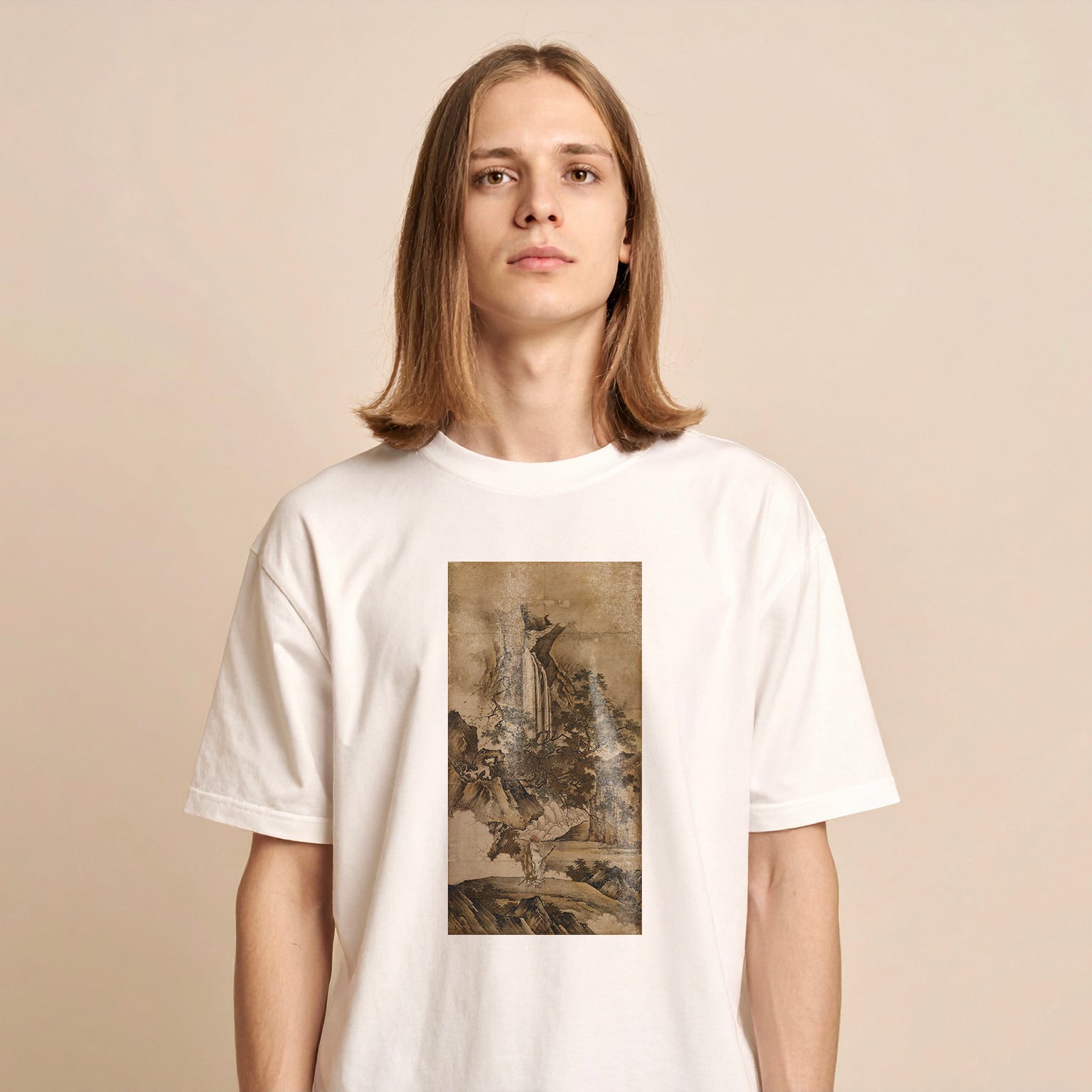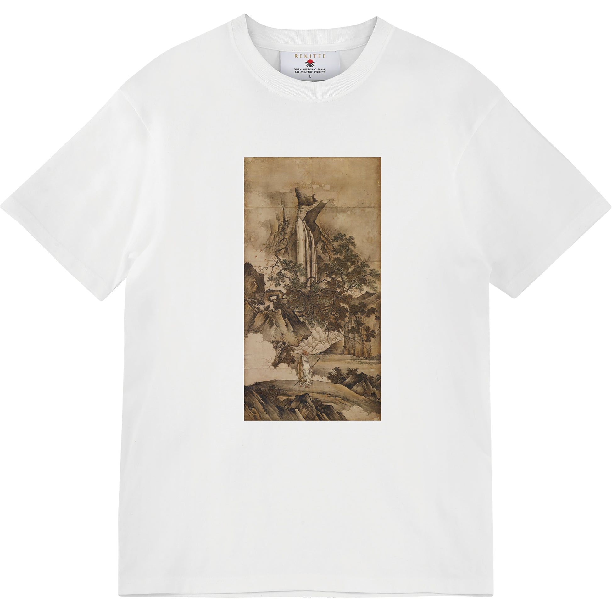 This painting illustrates a story of Zen monks from the Tang dynasty. It is based on the tale of the monk Reiun, who attained sudden enlightenment upon seeing peach blossoms in bloom. The composition is striking, featuring a grand waterfall at its center and the solitary figure of the monk standing amidst rugged cliffs.